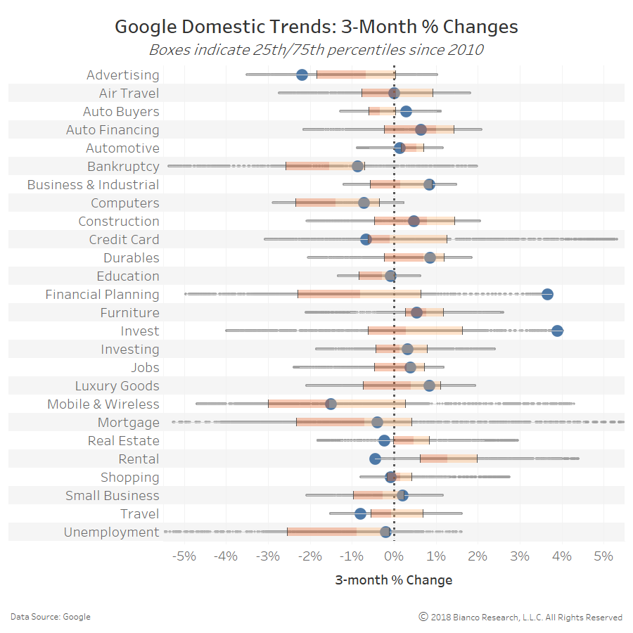 The chart below shows three-month changes in Google Domestic Trends with current as blue dots, ranges since 2010 as gray dots, and the 25th/75th percentiles as orange boxes. Google Domestic Trends offer very useful insight into the biases and convictions of consumers and businesses via their Google search traffic.