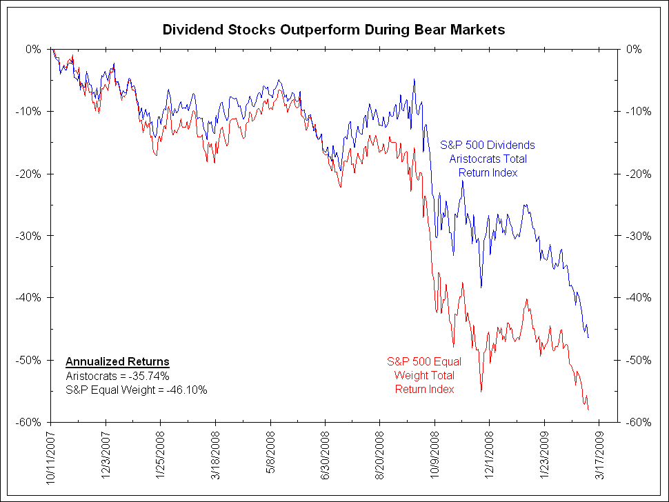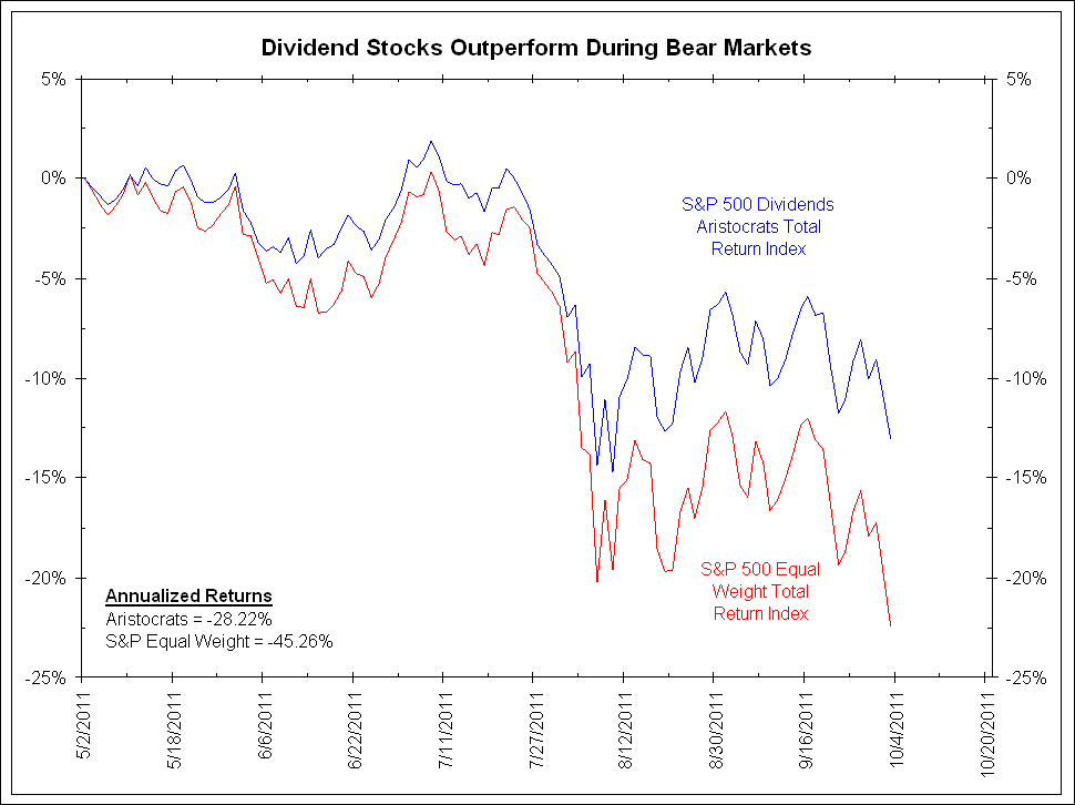 During the bear market from May 2, 2011 through October 3, 2011, dividend-paying stocks outperformed the S&P 500 Equal Weight Index by 9.40%. On an annualized basis, dividend stocks returned -28.22% versus -45.26% for the S&P Equal Weight Index.