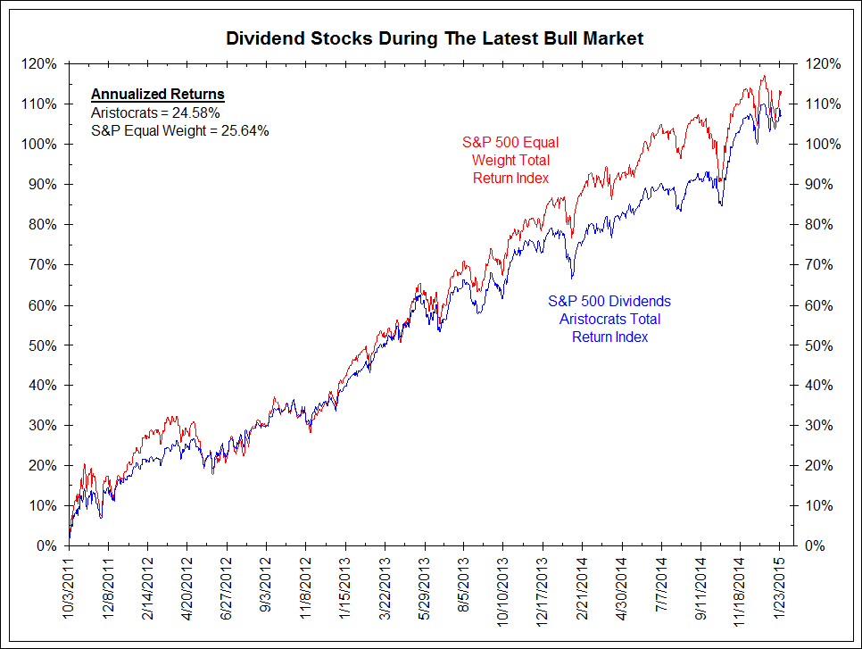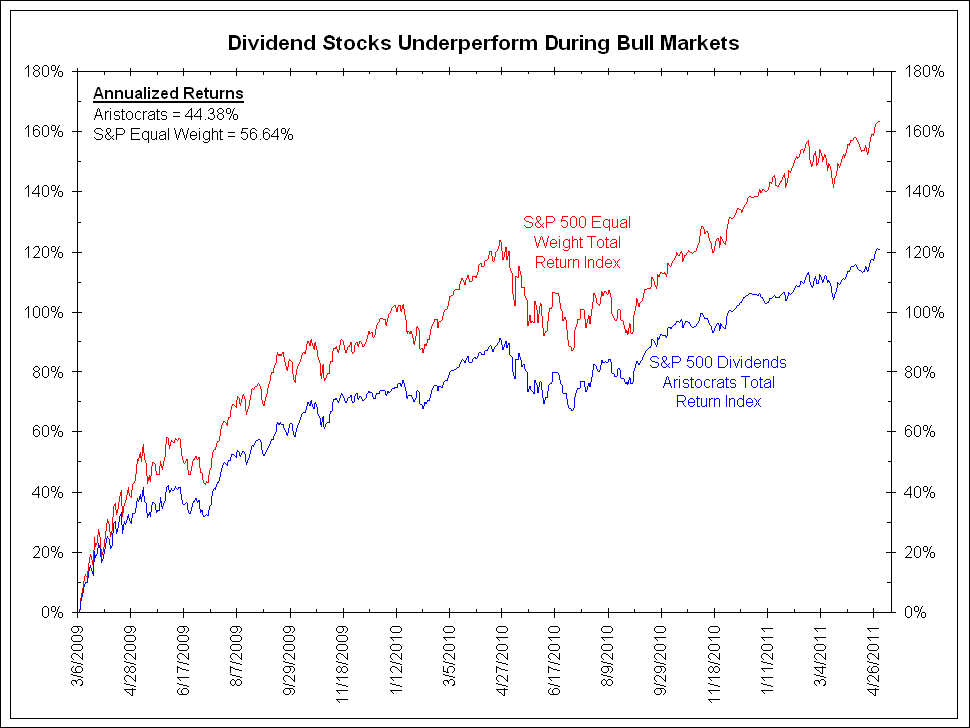 During the bull market from March 6, 2009 to May 2, 2011, dividend-paying stocks underperformed the S&P 500 Equal Weight Index by 42.4%. On an annualized basis, dividend stocks returned 44.38% versus 56.64% for the S&P Equal Weight Index.