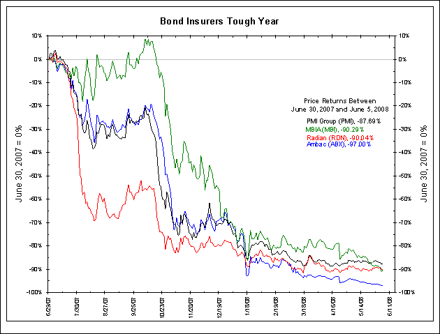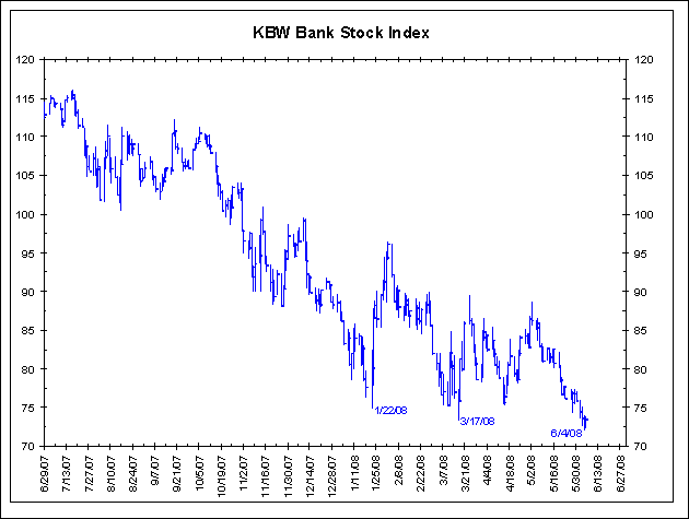 So, don’t look at MBIA (MBI) and Ambac (ABK) for the reaction to the downgrade alone. Look at the Bank Stock Index (BKX). Banks stocks are back to their mid-March panic low. This is in part because the downgrades mean even more Q2 losses for the banking sector. Now maybe these losses have been discounted, but for all the talk that the credit crisis is over, the bank stocks are in worse shape now than the day Bear failed. What changed? Maybe (again, in part) anticipation of the monoline downgrades.