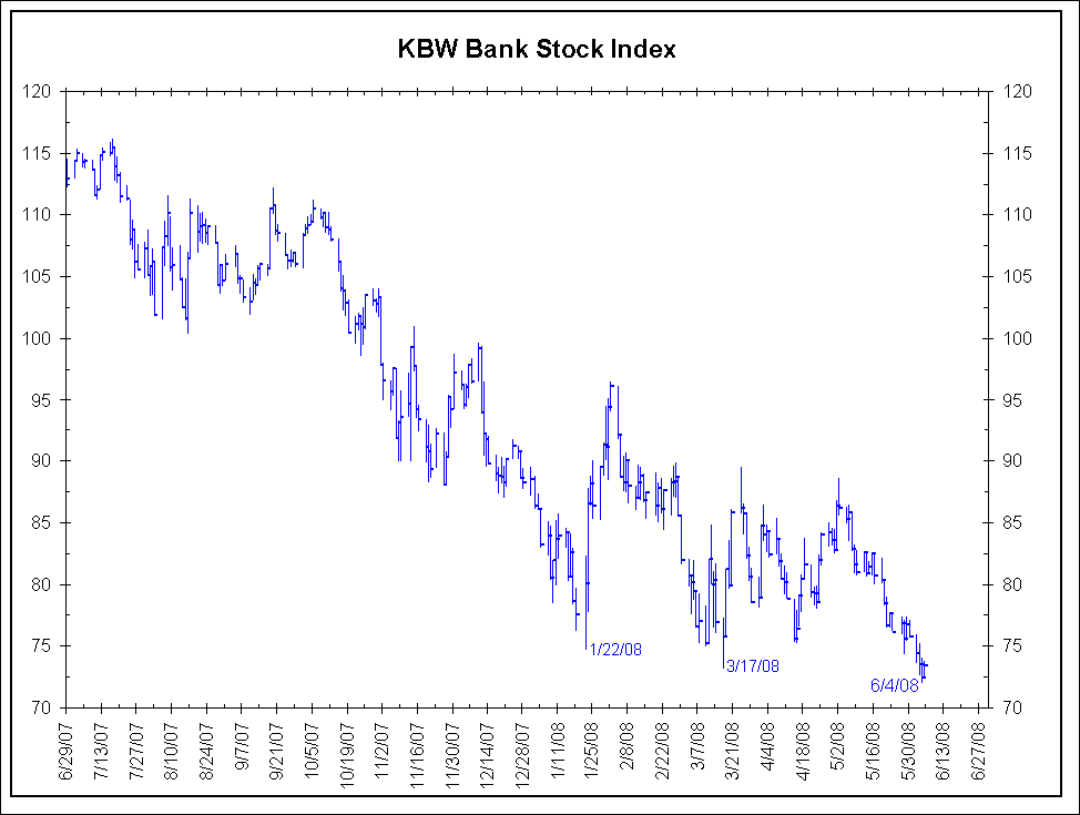 So, don’t look at MBIA (MBI) and Ambac (ABK) for the reaction to the downgrade alone. Look at the Bank Stock Index (BKX). Banks stocks are back to their mid-March panic low. This is in part because the downgrades mean even more Q2 losses for the banking sector. Now maybe these losses have been discounted, but for all the talk that the credit crisis is over, the bank stocks are in worse shape now than the day Bear failed. What changed? Maybe (again, in part) anticipation of the monoline downgrades.