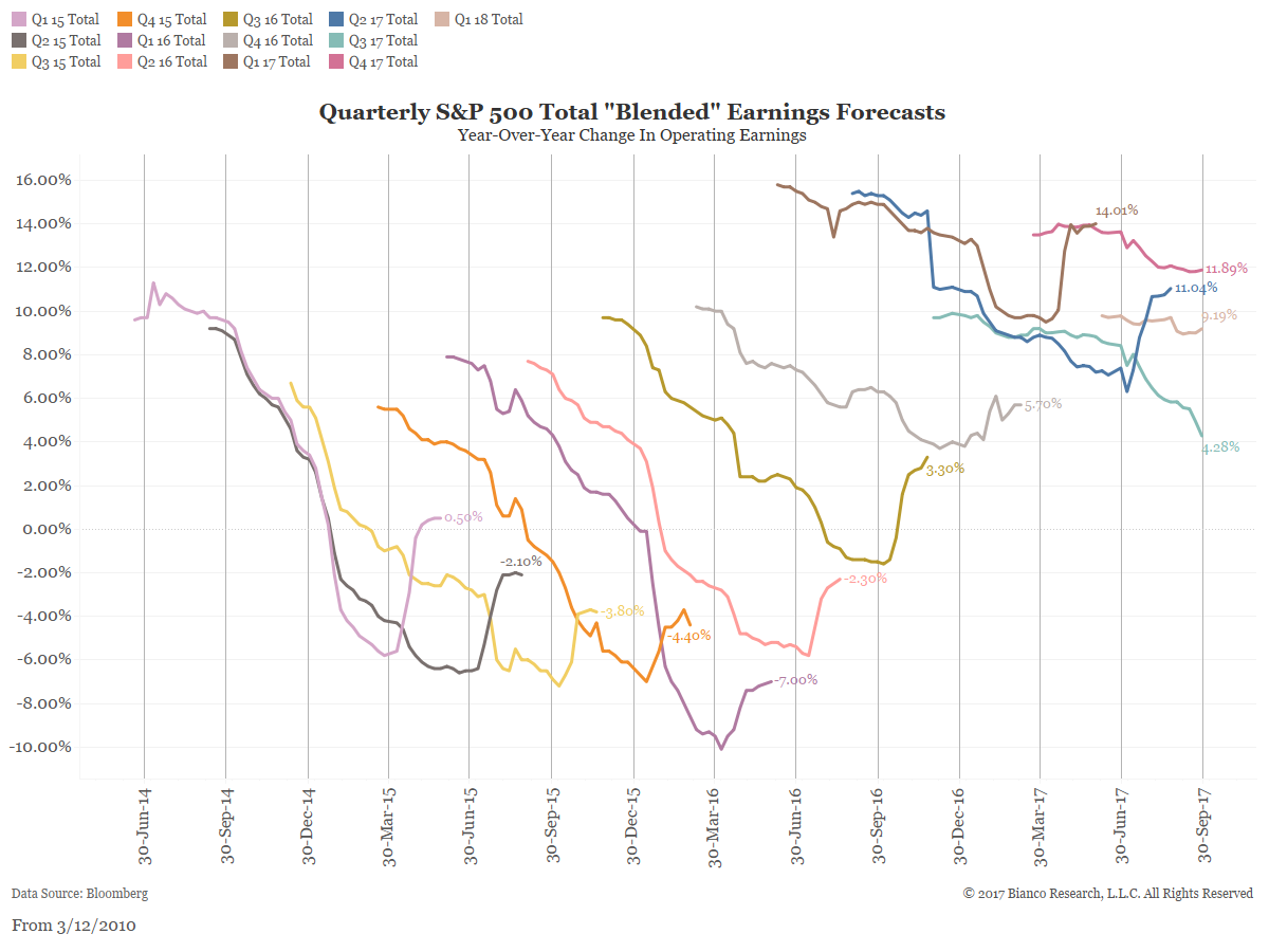 As the second chart shows, Q3’s expectations of 4.28% growth (light blue) are well below Q2’s growth rate. Remember about 70% of the companies beat and this estimate will bounce higher eventually.