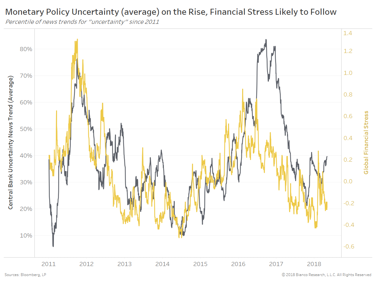 Uncertainty bleeding from peripherals (e.g. Argentina) to major central banks would likely induce higher financial stress, meaning higher volatility.