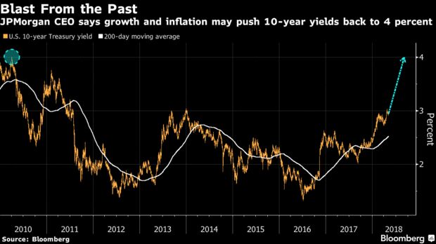 JPMorgan Chase & Co. Chief Executive Officer Jamie Dimon said it’s possible U.S. growth and inflation prove fast enough to prompt the Federal Reserve to raise interest rates more than many anticipate, and it would be wise to prepare for benchmark yields to climb to 4 percent. “It might force the 10-year up” if the Fed boosts short-term rates more than expected, Dimon said in an interview with Bloomberg Television’s Stephen Engle in Beijing, referring to the yield on 10-year Treasury notes. “You can easily deal with 4 percent bonds and I think people should be prepared for that.”