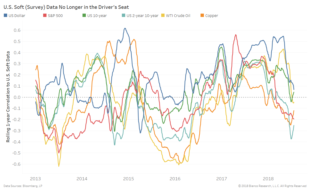 U.S. soft (survey) economic data has lost its positive correlation to major asset classes this summer. Business T.V. anchors and their guests may continue hyperventilating about sky-high consumer and business sentiment, but markets are no longer wowed. Risk markets have shifted attention back to inflation and central bank expectations.