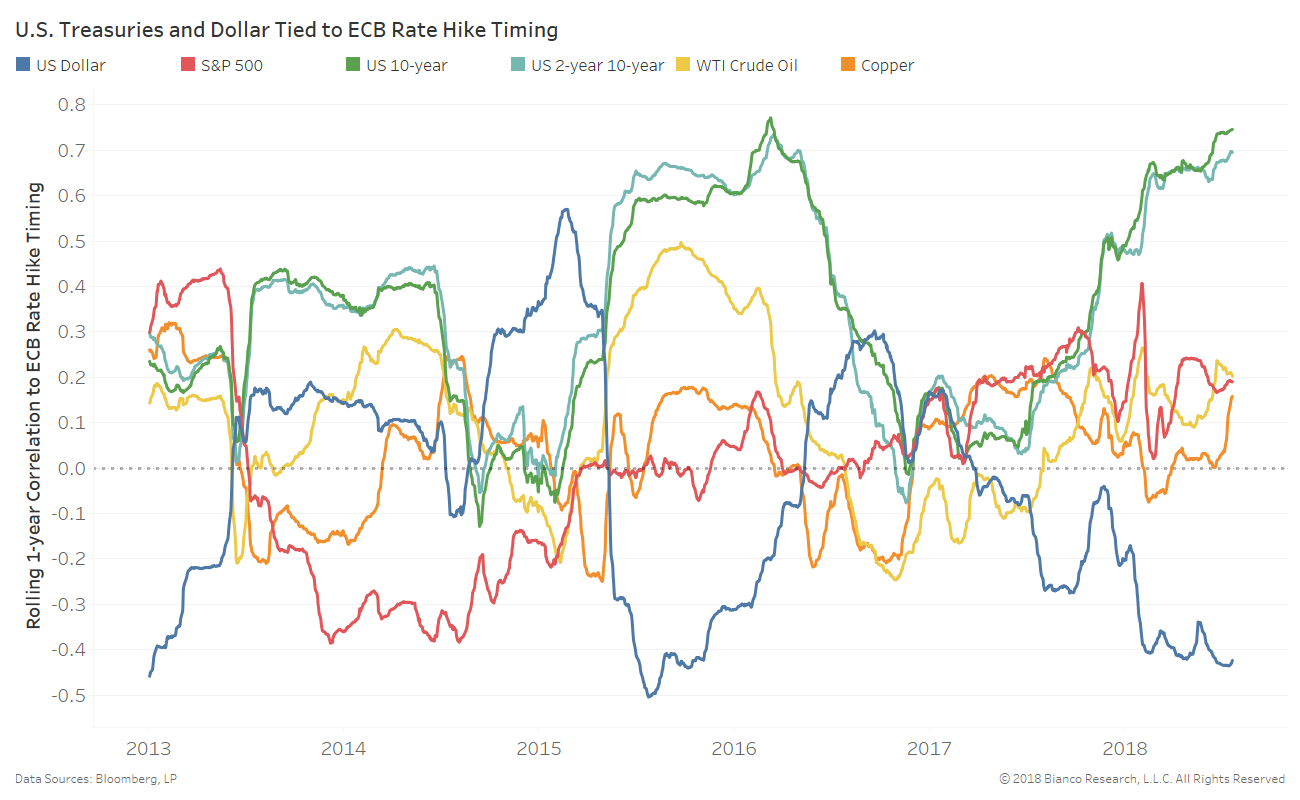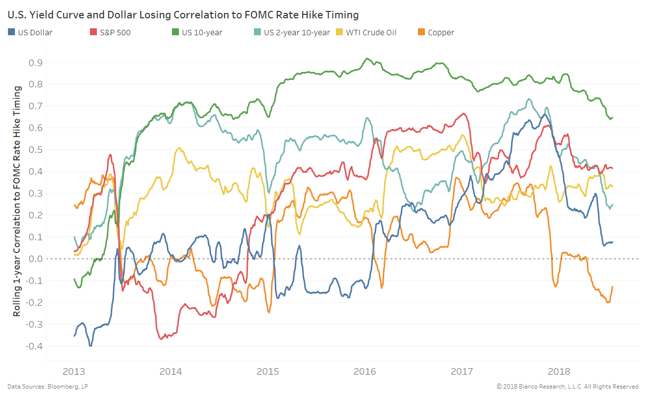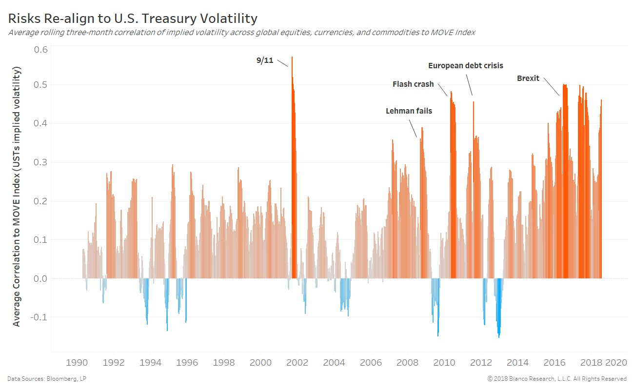 Past similar periods of heightened connection to U.S. Treasury volatility have occurred during major geopolitical or market events like Lehman failing, the flash crash, and Brexit. We are again struggling to label higher correlations in the summer of 2018, just like the year prior.