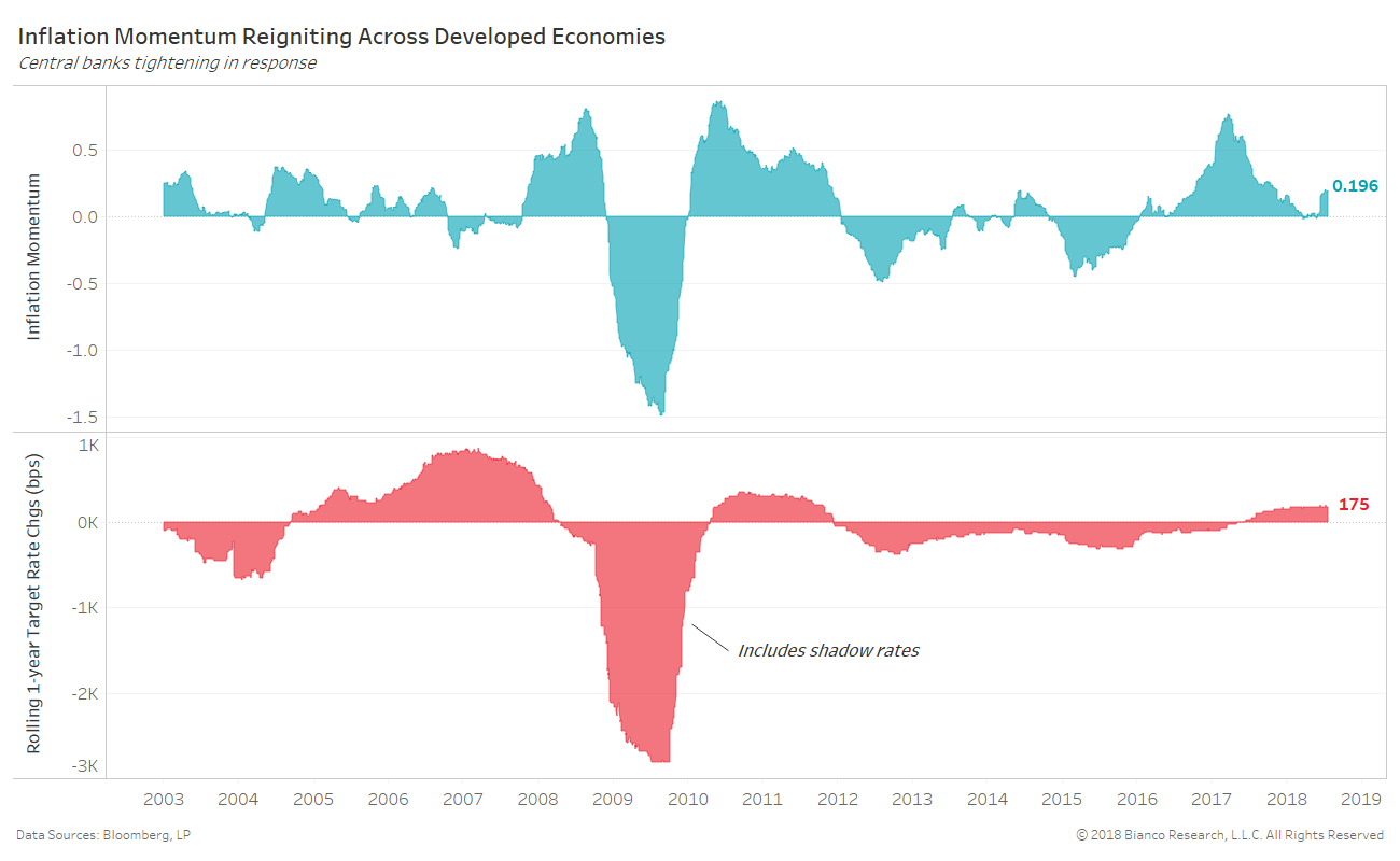 The momentum behind inflation is again rebounding after slowing in early 2018. Not surprisingly, developed central banks have raised rates by a total of 175 bps over the past year when including shadow rates. Remember, shadow rates translate balance sheet changes (flow) into rate changes. Stronger inflation momentum keeps the door very open for the ECB to join the party in 2019.