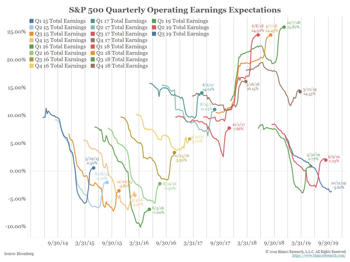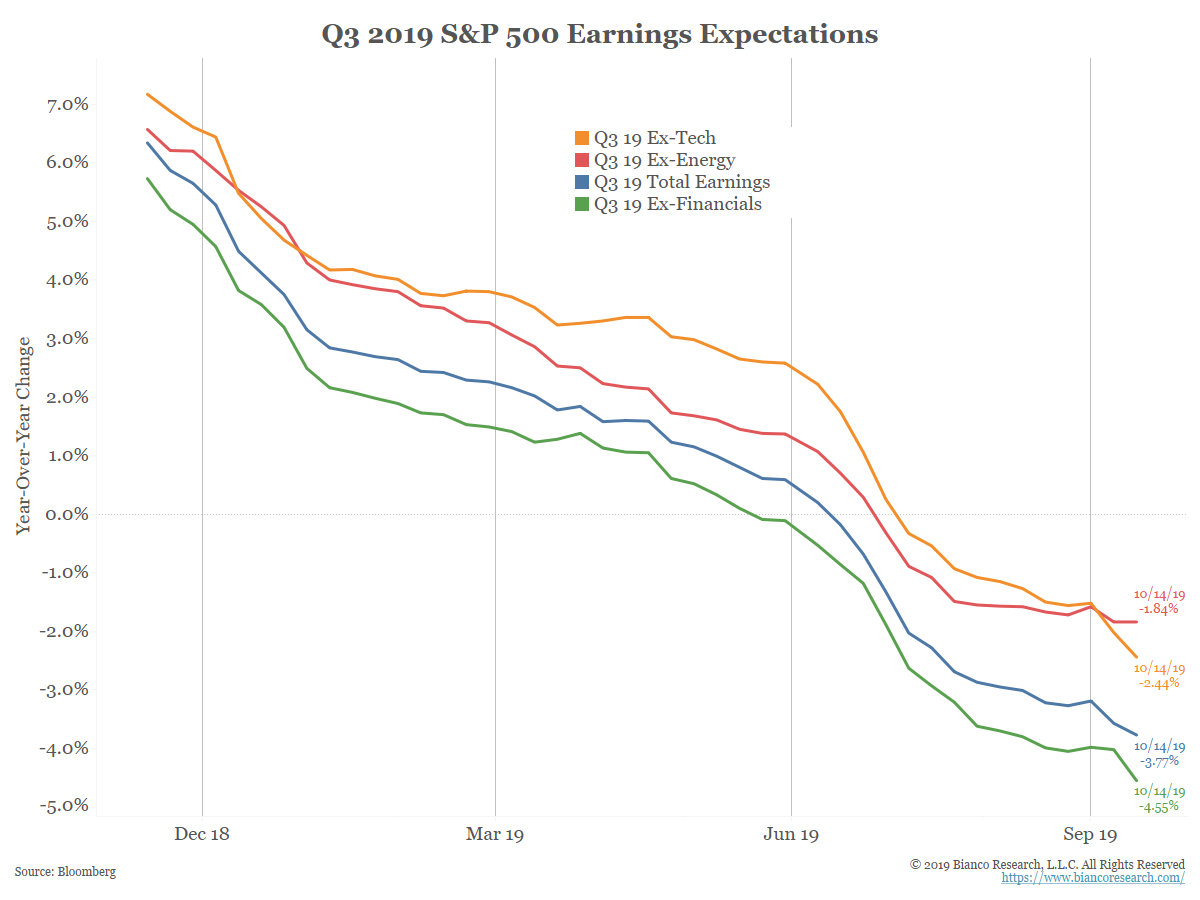 Q3 2019 earnings season is now underway. Through Friday, 77 S&P 500 companies have reported results (15%). Analysts estimate S&P 500 earnings growth declined by 3.62%. Typically, as earnings season begins and companies beat artificially low estimates, this growth figure bounces almost 4%. If this historical average holds in Q3, earnings should barely eke out positive growth.... Read More