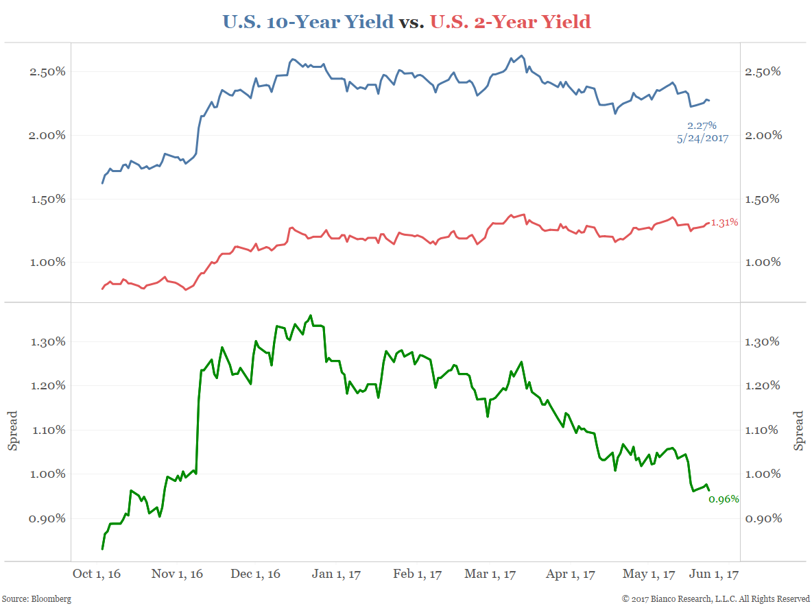 The short end of the yield curve is “rising on expectations of tighter monetary policy, while the low end is more correlated to growth … so I think the case could be made that the curve continues to narrow,” Oppenheimer technical analyst Ari Wald said Monday on CNBC’s “Trading Nation.” Yet this doesn’t worry Wald, who noted that the yield spread turned fully negative before each of the four most recent recessions. “We don’t think the flatter curve is a warning,” he said. “As long as banks can borrow short[-term debt] and lend long[-term debt], we think the economy can do just fine and the stock market can do just fine.” “The flattening ties into the fading of expectations for some kind of fiscal push this year,” Caron said Monday on “Trading Nation.” “This is the broader representation of a resetting of expectations, in the United States at least, and the expectation for maybe slower growth than what we expected just after the election.”