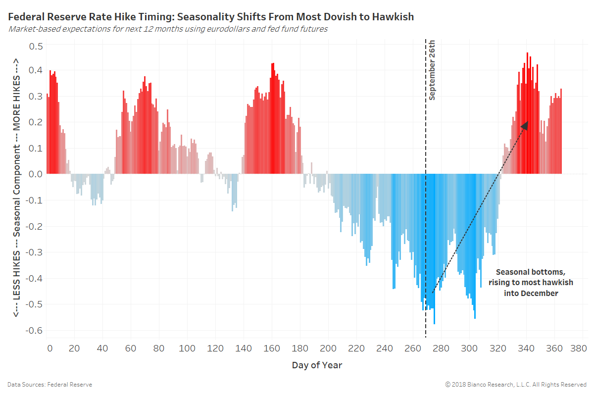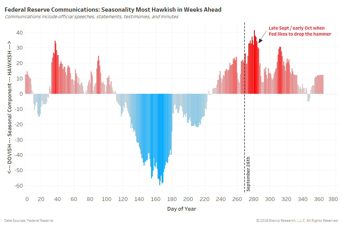 Markets should not be surprised by the Fed’s recent hawkish rhetoric. Official communications have seasonally become the most hawkish into late September through October since 1997.