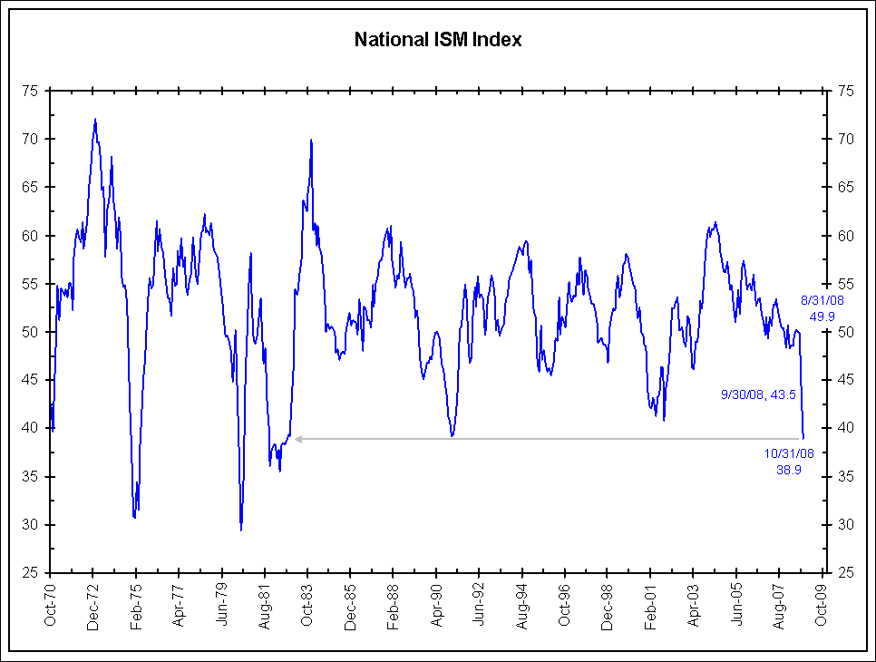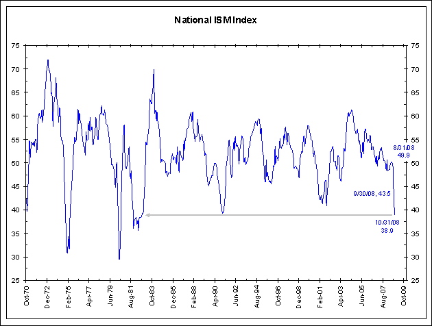 On Friday, October 31, the Chicago region ISM manufacturing survey (chart above) was released, showing its biggest ever one-month decline to a seven-year low.