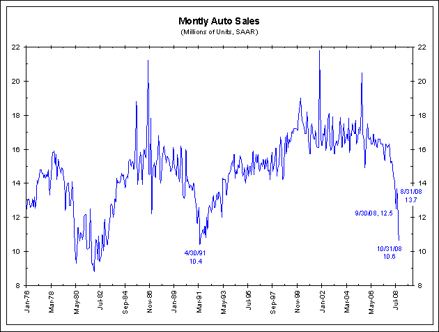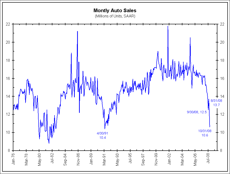 U.S. auto sales plummeted 32 percent in October to the lowest monthly total since January 1991, led by General Motors Corp.‘s 45 percent slide, as reduced access to loans and a weaker economy kept consumers off dealer lots. Ford Motor Co. reported a 30 percent drop in car and light- truck sales from a year earlier and Toyota Motor Corp.’s declined 23 percent. Honda Motor Co.’s slid 25 percent, Nissan Motor Co.’s were down 33 percent and Chrysler LLC’s fell 35 percent. `If you adjust for population growth, it’s the worst sales month in the post-World War II era” for the industry, said Mike DiGiovanni, GM’s chief sales analyst, on a conference call. “Clearly we’re in a dire situation.” Industrywide U.S. auto sales fell for the 12th straight month, extending the longest slide in 17 years. Tight credit, falling consumer confidence and the weakening economy, the same forces that suppressed buying in September, hurt automakers again last month.