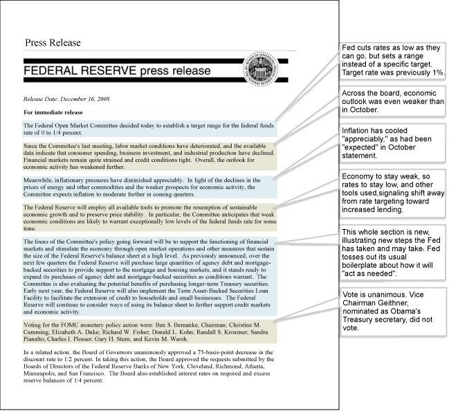 The Federal Open Market Committee decided today to establish a target range for the federal funds rate of 0 to 1/4 percent…The Federal Reserve will employ all available tools to promote the resumption of sustainable economic growth and to preserve price stability. In particular, the Committee anticipates that weak economic conditions are likely to warrant exceptionally low levels of the federal funds rate for some time. The focus of the Committee’s policy going forward will be to support the functioning of financial markets and stimulate the economy through open market operations and other measures that sustain the size of the Federal Reserve’s balance sheet at a high level. As previously announced, over the next few quarters the Federal Reserve will purchase large quantities of agency debt and mortgage-backed securities to provide support to the mortgage and housing markets, and it stands ready to expand its purchases of agency debt and mortgage-backed securities as conditions warrant. The Committee is also evaluating the potential benefits of purchasing longer-term Treasury securities. Early next year, the Federal Reserve will also implement the Term Asset-Backed Securities Loan Facility to facilitate the extension of credit to households and small businesses. The Federal Reserve will continue to consider ways of using its balance sheet to further support credit markets and economic activity. -