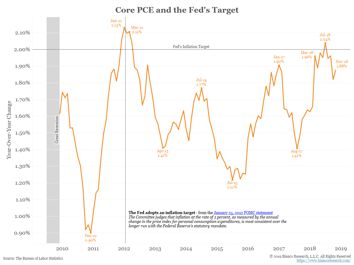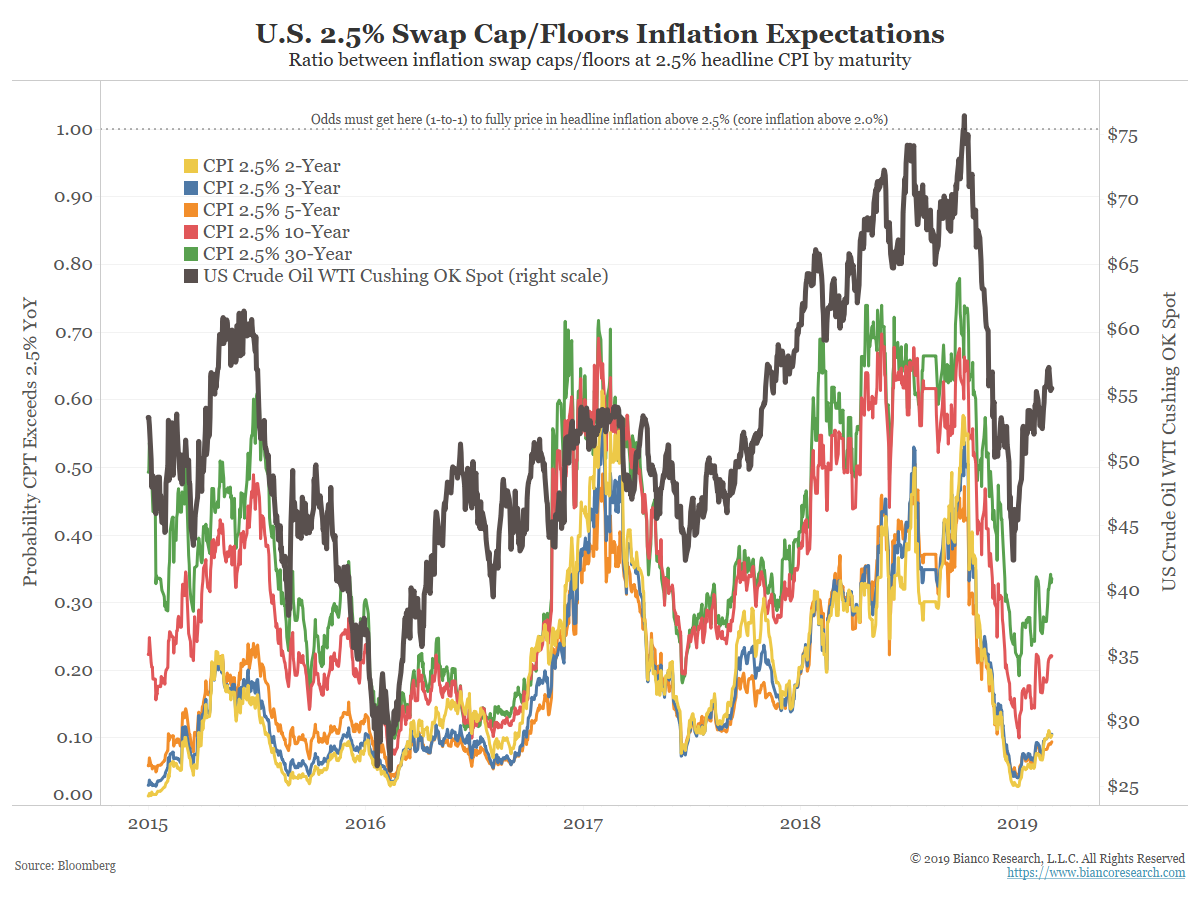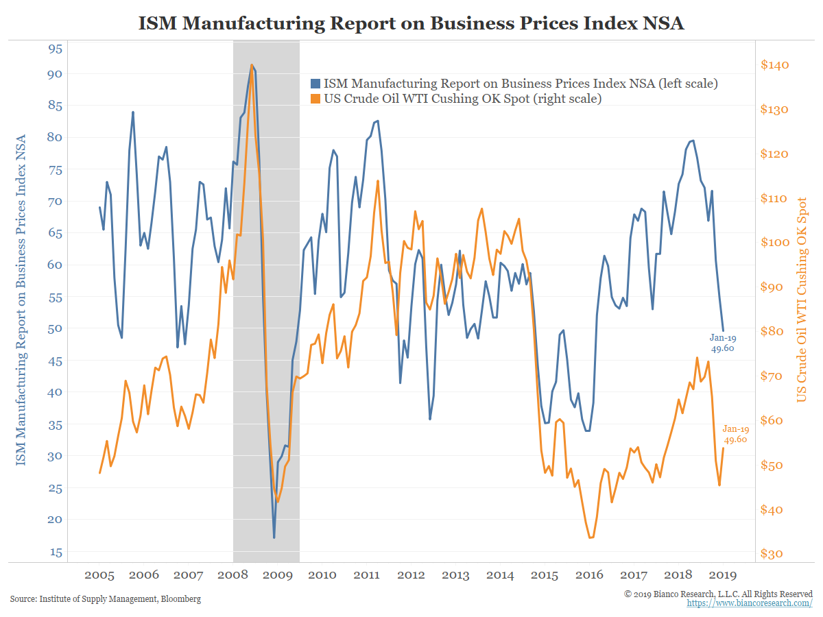 The energy sector, both commodities and services, only account for 7.1% of the overall CPI (December 2018). While this sounds small, the chart shows WTI prices move in tandem with inflation expectations.
