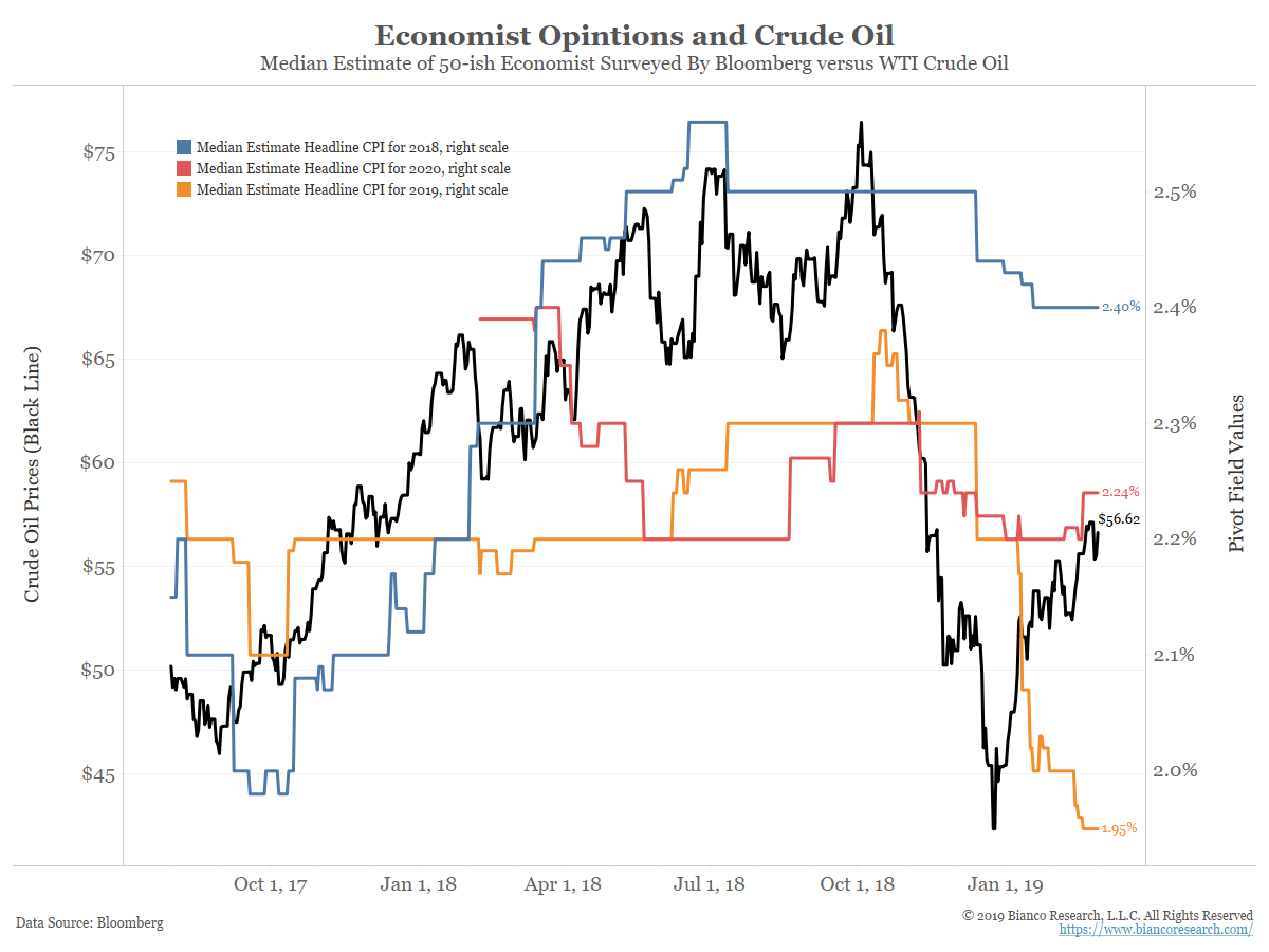 When crude oil was rising in 2017 and early 2018, the 2018 forecasts for inflation (blue) were rising. When crude oil was collapsing in late 2018, the 2019 forecasts for inflation (orange) were falling. The relationship between crude and this measure of inflation expectations is apparent.