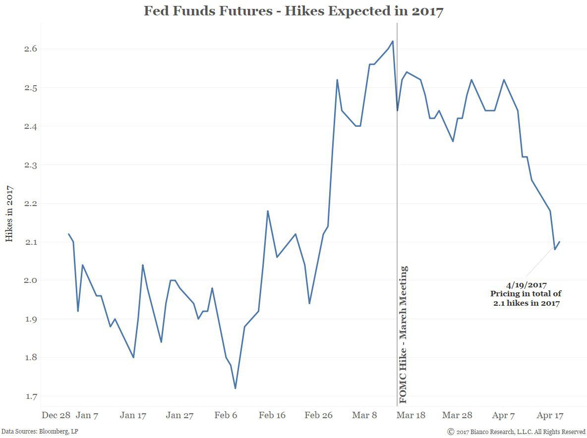 The chart above shows the odds of a rate hike at the June FOMC meeting are now under 50% (the odds of a hike at the May 3rd FOMC meeting are just 13%). While several Fed officials have talked about the virtues of reducing the balance sheet, the market simply thinks the Fed will be forced to move at a much slower pace. The markets remain calm because they aren’t buying what the Fed is selling, not because they have accepted a reduced balance sheet.