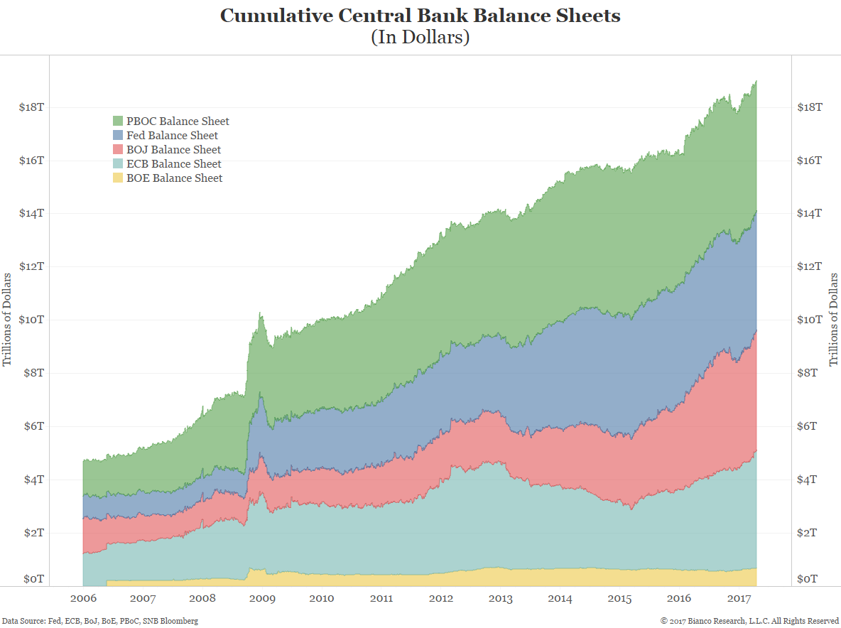 After heading into the uncharted territory of quantitative easing, the world’s central banks are starting to plan their course through the uncharted waters of quantitative tightening. How the Federal Reserve, European Central Bank and — eventually — the Bank of Japan handle the transition could make the difference between a global rerun of the 2013 “taper tantrum,” or the near undetectable market response to China’s run-down of U.S. Treasuries in recent years. Combined, the balance sheets of the three now total about $13 trillion, equating to greater than either China’s or the euro region’s economy. Former Fed Chair Ben S. Bernanke — who triggered the 2013 sell-off in risk assets with his quip on tapering asset purchases — has argued for a pre-set strategy to shrink the balance sheet. Current Vice Chairman Stanley Fischer says he doesn’t see a replay of the 2013 tantrum, but the best laid plans of central bankers would soon go awry if markets can’t digest the great unwinding.