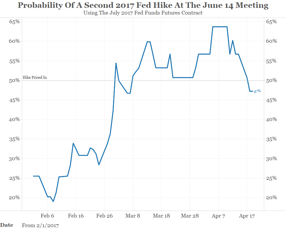 Traders are pulling back from bets the Federal Reserve will raise interest rates in June as inflation expectations crumble. The odds of a hike have fallen back to about 44 percent from more than 60 percent earlier this month, based on a gauge compiled by Bloomberg. Yields on federal funds futures contracts for June and July are retreating as investors scale back forecasts for a move. Two-year Treasuries, among the most sensitive to Fed policy expectations, are poised for their first two-month rally in a year. Investors are questioning the strength of the U.S. economy and the Fed’s plan to raise rates three times in 2017 after a weaker-than-expected March jobs gain and a surprise monthly drop in consumer prices. They’re also voicing disappointment that President Donald Trump’s proposed tax cuts and infrastructure spending plans have yet to materialize.