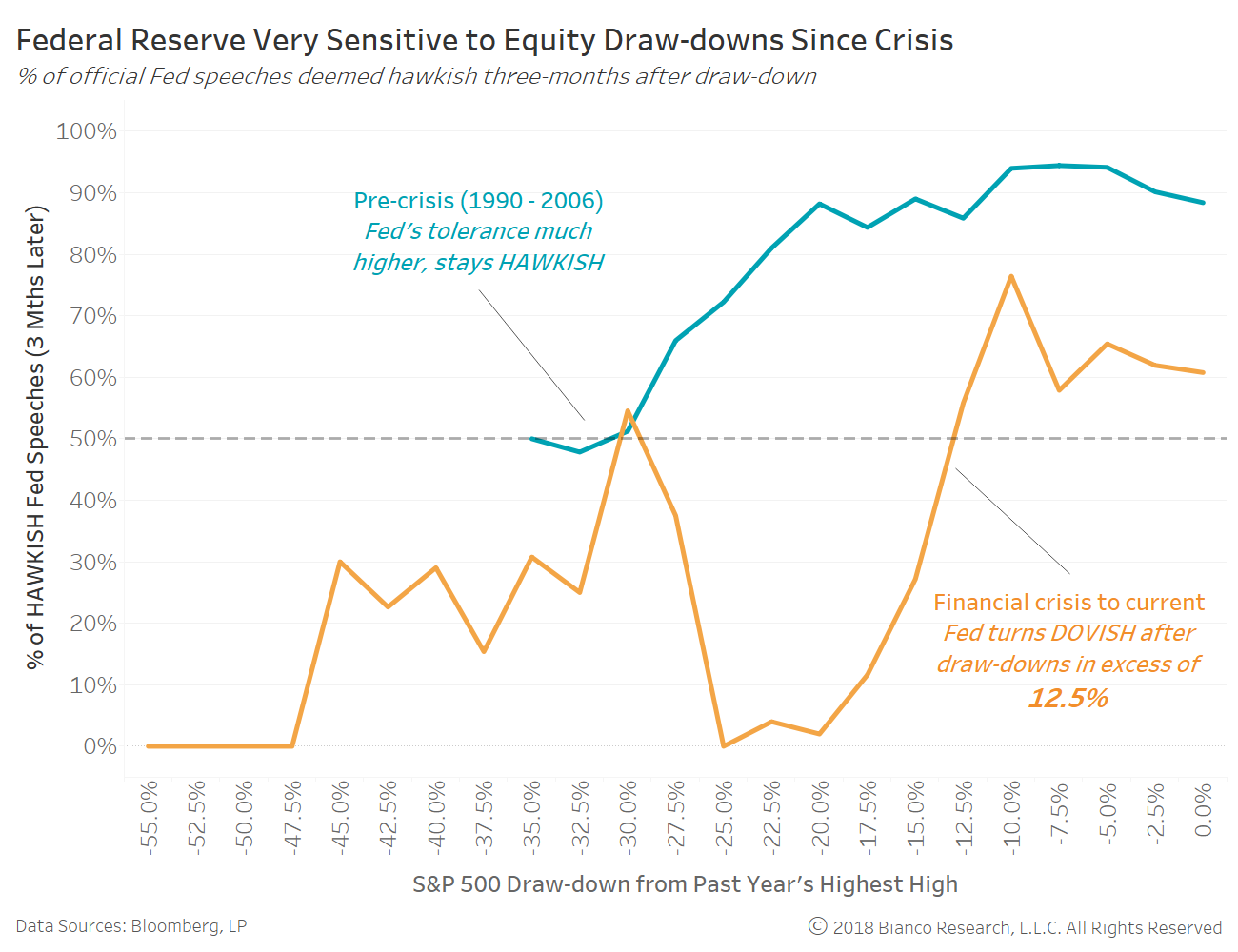 We can measure the Fed’s sensitivity to S&P 500 drawdowns using their reactions (i.e. hawkish-to-dovish leaning) found within official speeches. The chart below shows the S&P 500’s drawdown from its highest high over the preceding 12 months on the y-axis. The percentage of Fed speeches offering hawkish rhetoric over the following three months are shown on the y-axis for the 1990 – 2006 (blue) and 2007 – current (orange) periods.