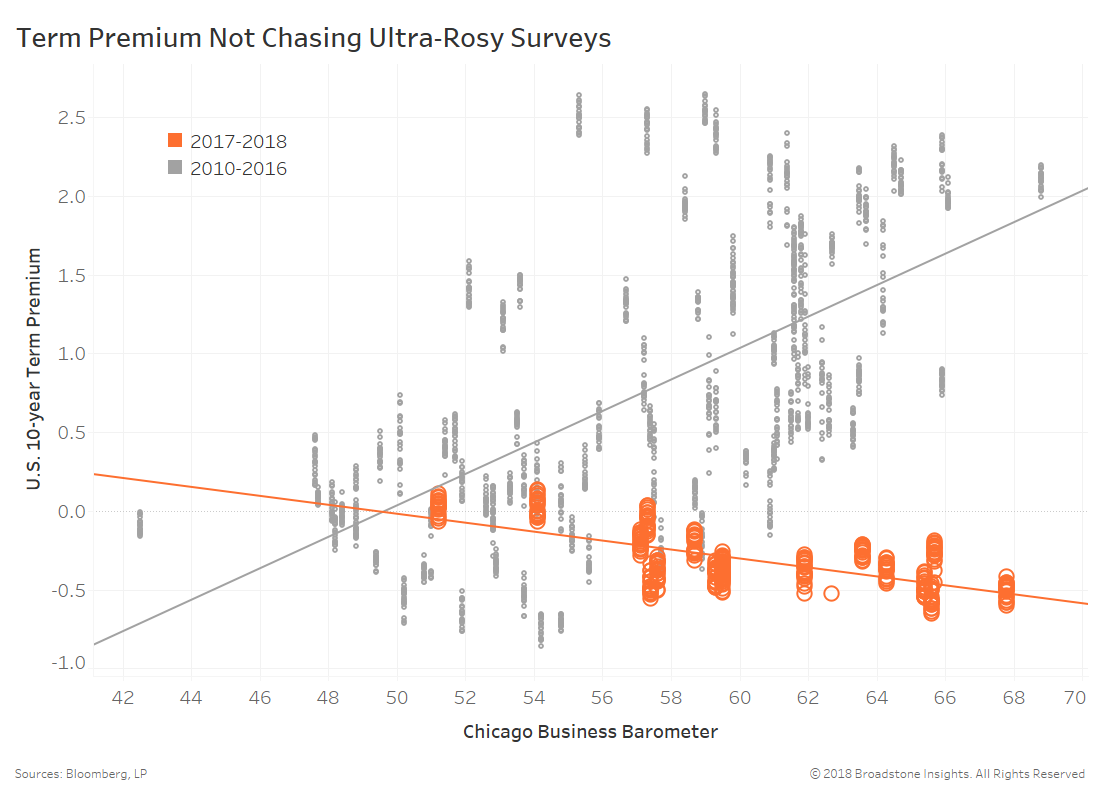 Last week also included a big beat by the Chicago Business Barometer (62.7 vs est 58.3), continuing the streak of ultra-rosy survey results. The scatterplot below shows the relationship between this business barometer and U.S. 10-year term premiums since 2010. We have highlighted in orange the very different 2017 – 2018 period when better and better survey results have very oddly led to lower term premiums.