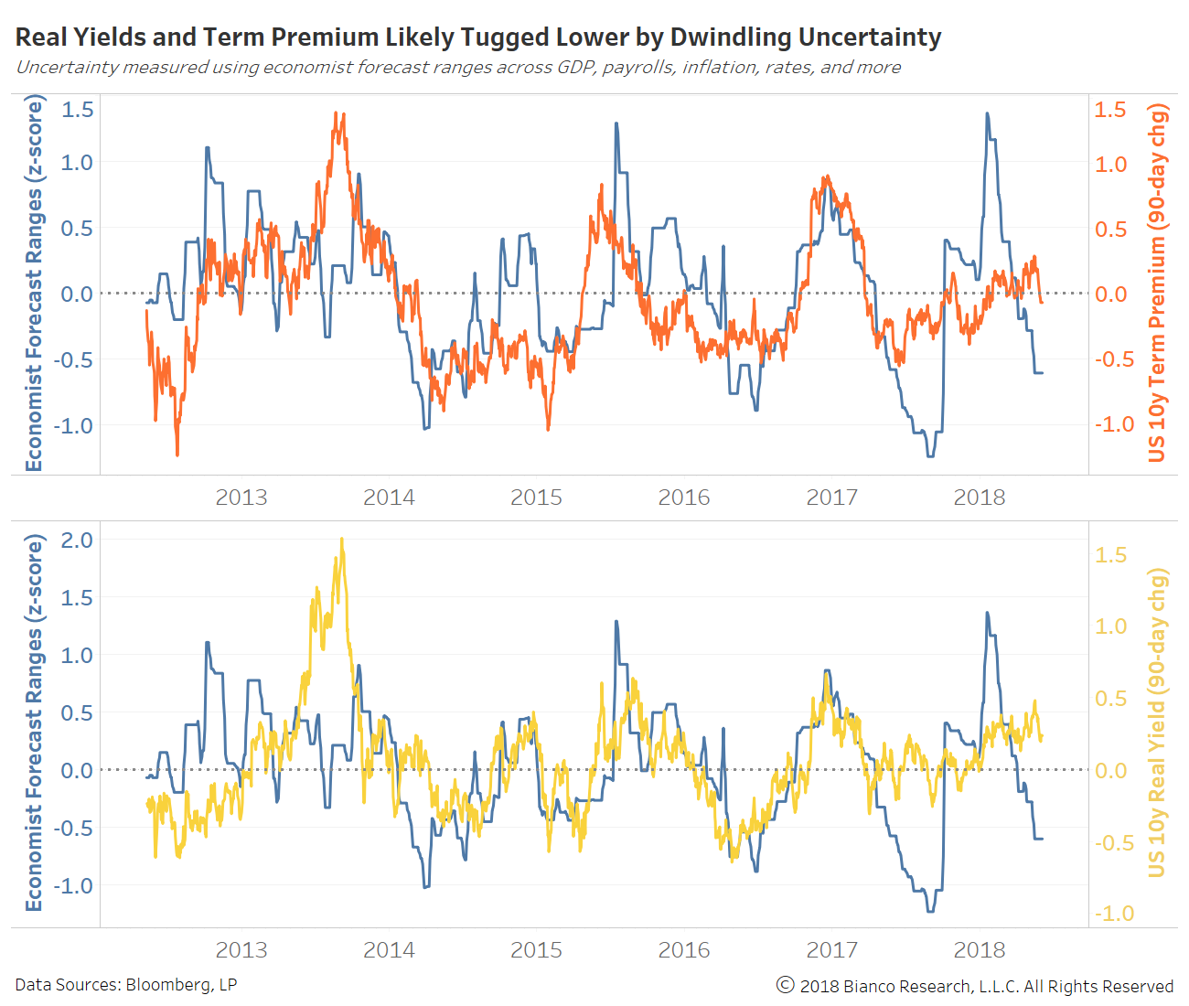 The chart below shows the average of economist forecast ranges (z-score) on the left axis along with 90-trading day changes in U.S. 10-year term premium (top panel) and real yields (bottom panel). Lower uncertainty by economists is being matched with lower uncertainty by bond investors.