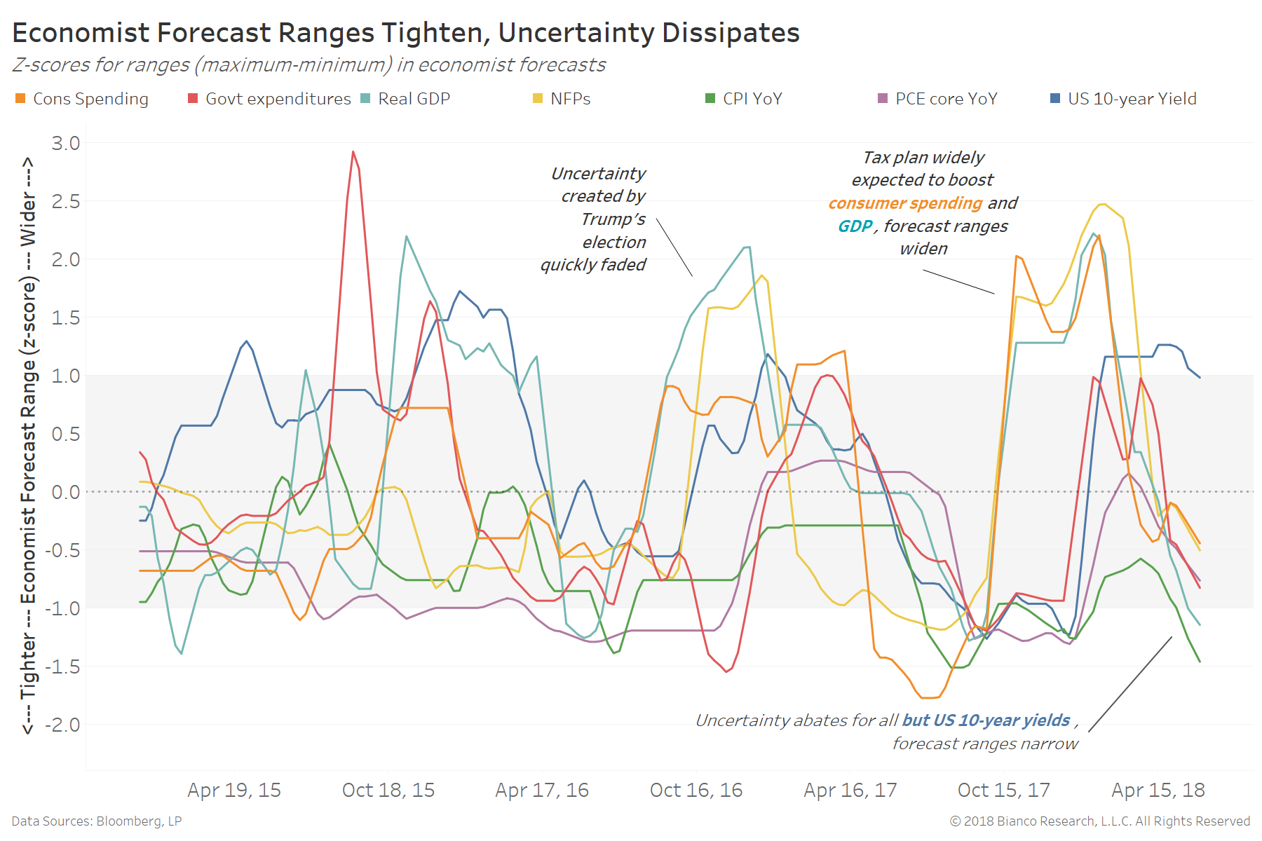 Turning back to the U.S., economists are offering forecasts much more clustered together than seen just after the tax plan vote. The chart below shows economist forecast ranges (max minus min) for the next four quarters represented as z-scores. We include forecasts for real GDP, payrolls, inflation, yields, and more.