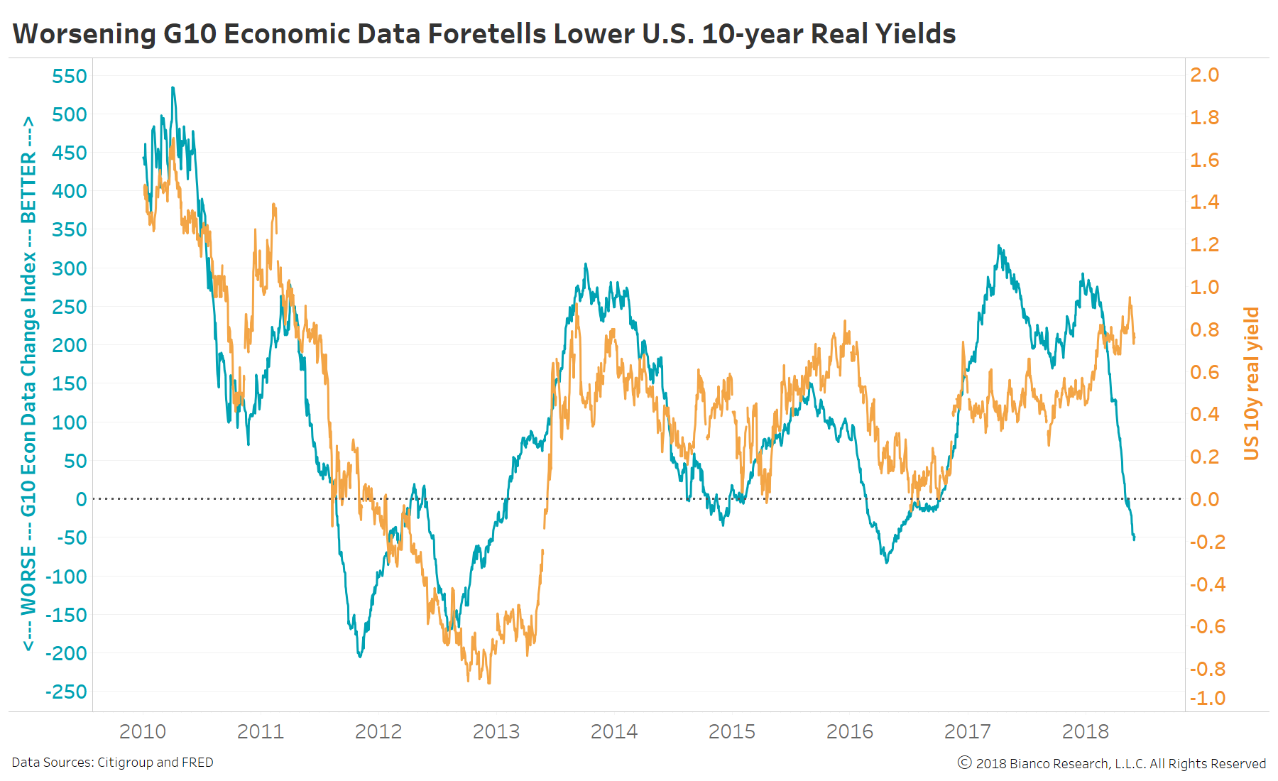 The chart below shows the G10’s Citigroup Economic Data Change Index (blue) along with U.S. 10-year real yields (orange). Data change indices measure incoming releases relative to one-year average growth rates.