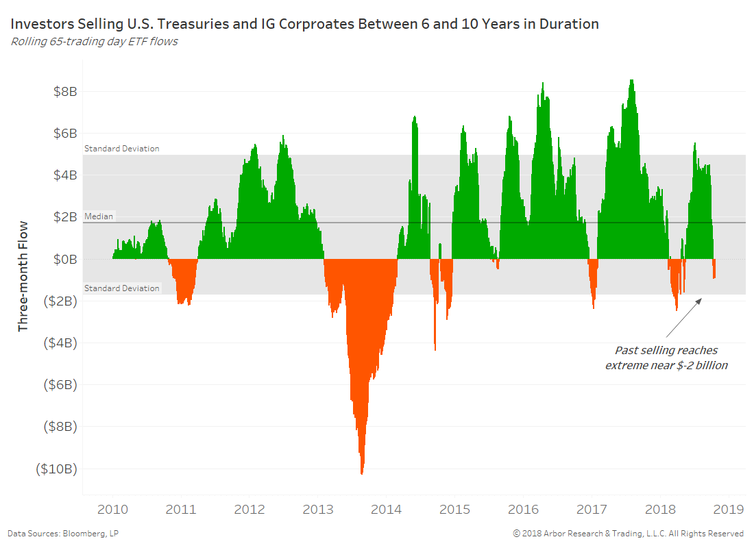 Investors have been shedding any U.S. Treasury or investment grade corporate ETF with a duration above three years. The 65-day flow of these ETFs has turned negative and on pace to reach similar amounts of past bearish cycles near $2 billion.