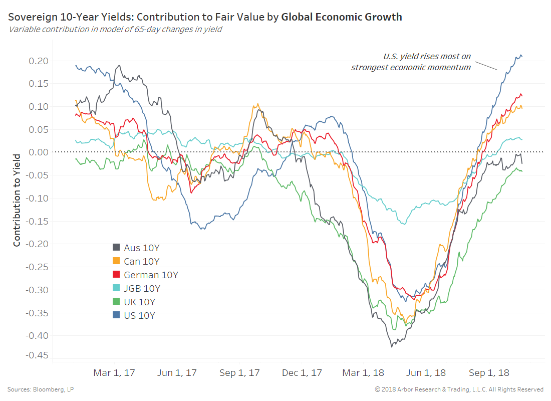 The chart below shows the contribution of global economic growth measures to 65-day changes in each sovereign 10-year yield. We produce fair value estimates using a model combining the real-time benefits of alternative data like Google search trends with traditional economic data.