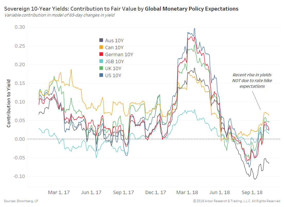 The next chart shows the contribution of global monetary policy expectations to developed sovereign 10-year yields. Rising rate hike expectations helped fuel higher yields in January and February 2018, but little bump has occurred in recent weeks.