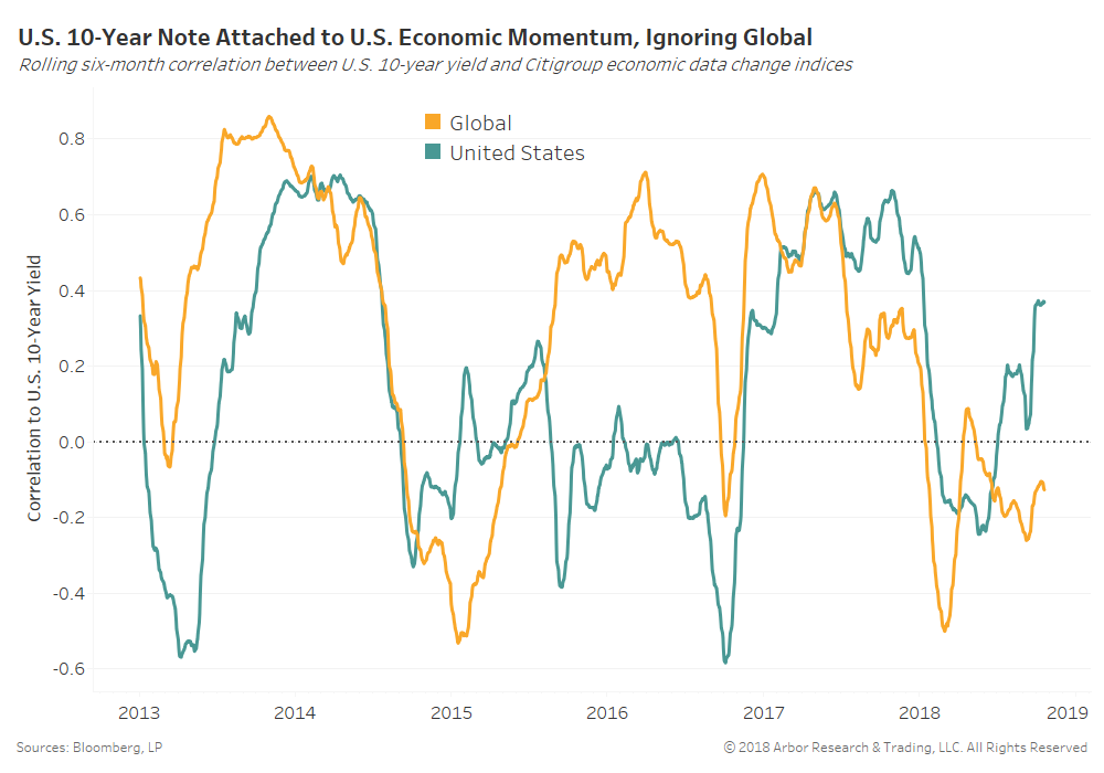 U.S. 10-year notes, the world’s most-watched safety zone of choice, has disconnected from global economic data. Instead, bond investors have reacted almost exclusively to U.S. economic data since the summer of 2018.