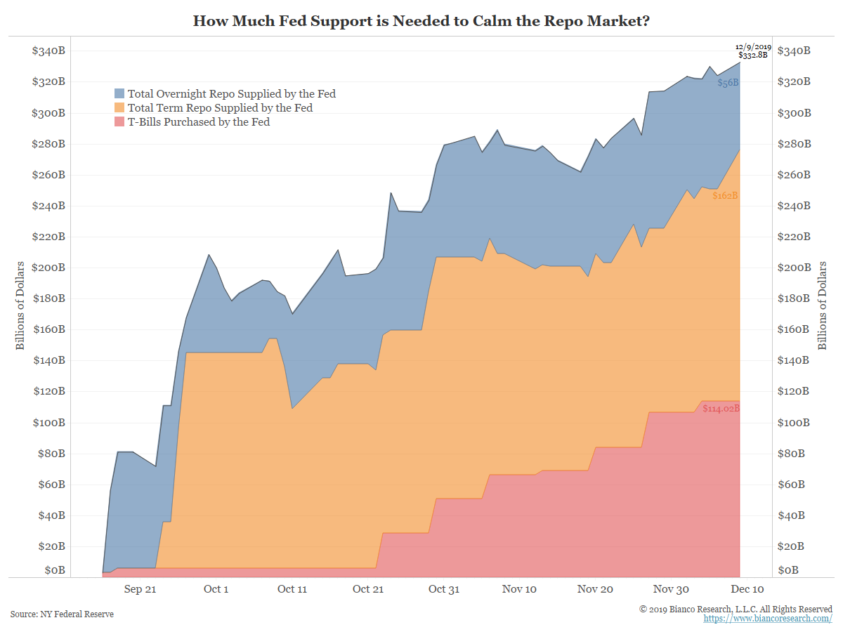 This morning the Fed offered the third of three term repo operations that matures after year-end. Banks submitted $43 billion in bids for the $25 billion offering. As the chart below shows, the Fed’s support of the repo market now stands at over $330 billion.