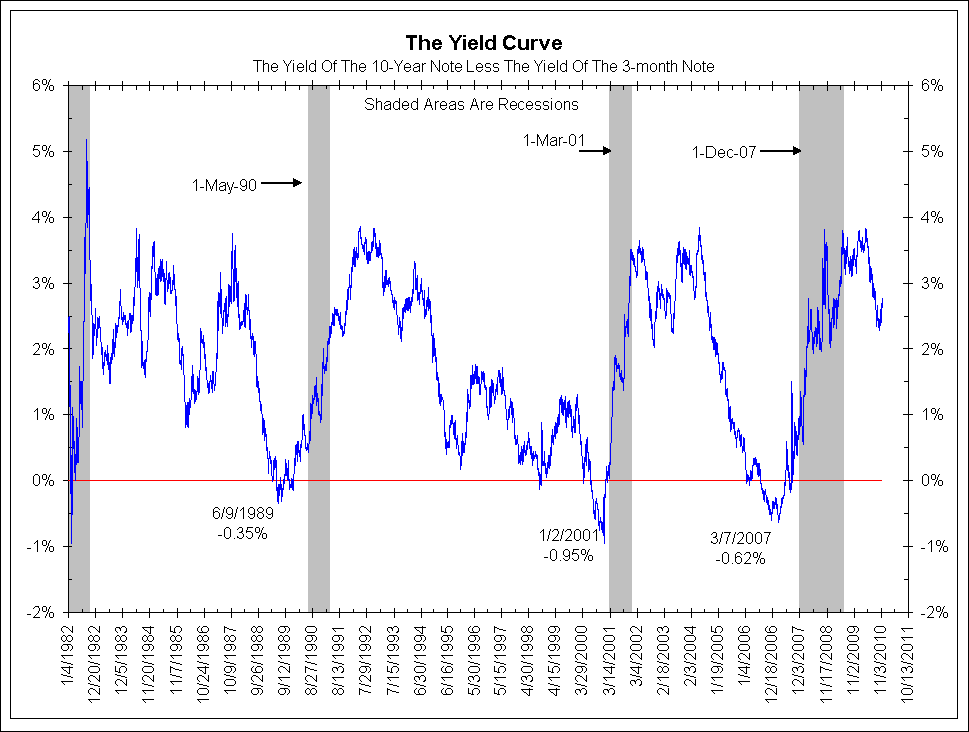 Green shoots are proliferating in gardens across America, but for some forecasters it already looks like the end of summer. A few are even hinting at recession by year-end. That’s highly unlikely. While black swans have gained a new cachet following the prices-can’t-fall-nationwide housing bust and the financial meltdown it triggered, the most important leading indicator, the yield curve, is saying there will be no recession anytime soon. With the Federal Reserve’s benchmark rate at zero to 0.25 percent and the 10-year Treasury note yielding 3.06 percent, the spread between the two interest rates is among the widest in history. It’s the reverse configuration, an inverted yield curve with short rates above long rates, that augurs recession. The spread — or the “term structure of interest rates,” as it’s known in academic circles — isn’t some mystical talisman with omniscient powers. It derives its prognosticating ability from the simple fact that one rate is artificially pegged by the central bank while the other is determined by the market. Their relationship encapsulates the stance of monetary policy.