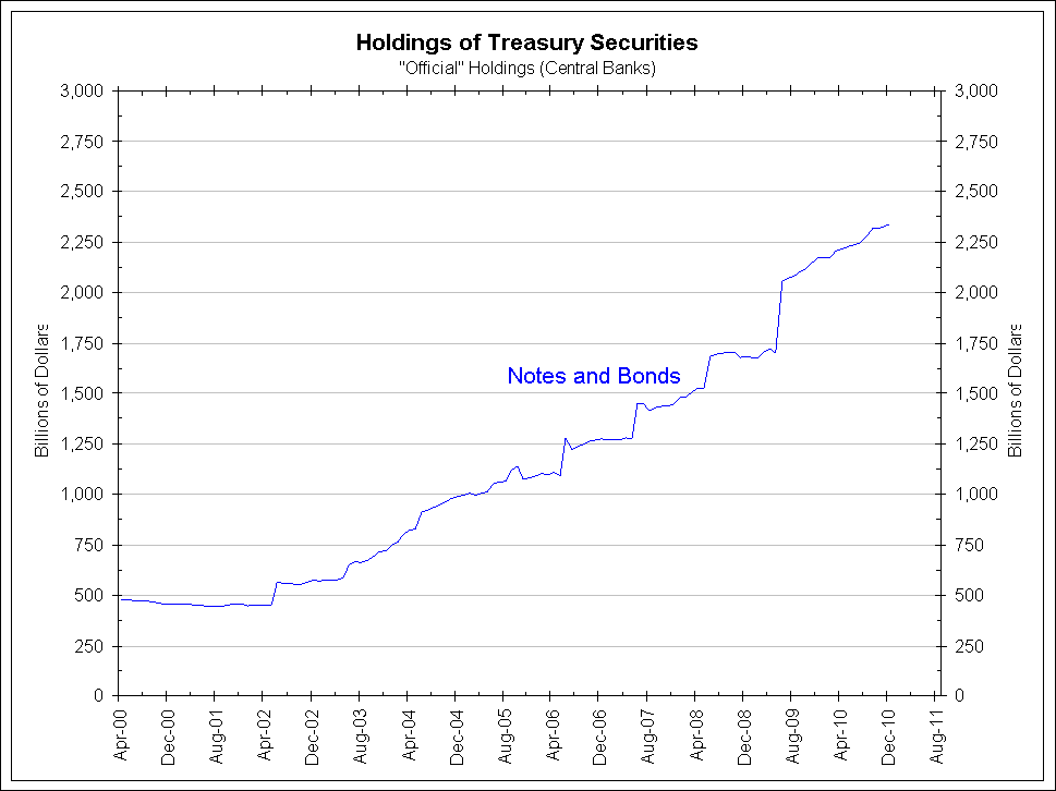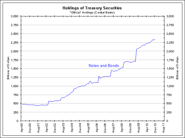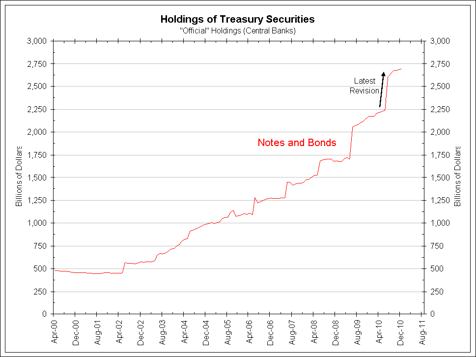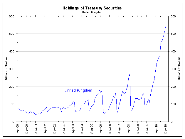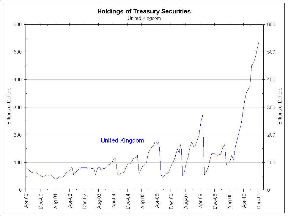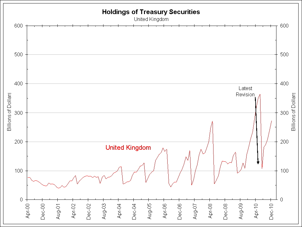 In a January Newsclip post, we pointed out that the U.K. accounted for 47% of all foreign purchases of U.S. Treasury notes and bonds in the 12 months ending November 2010. However, we warned that this was a result of the way in which the Treasury collects the data rather than true increased interest from the U.K.