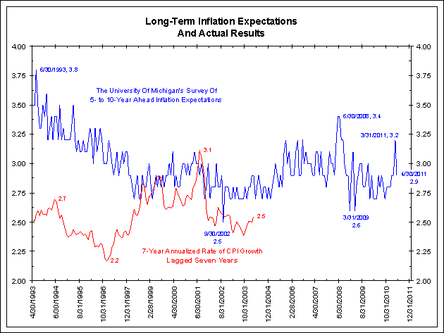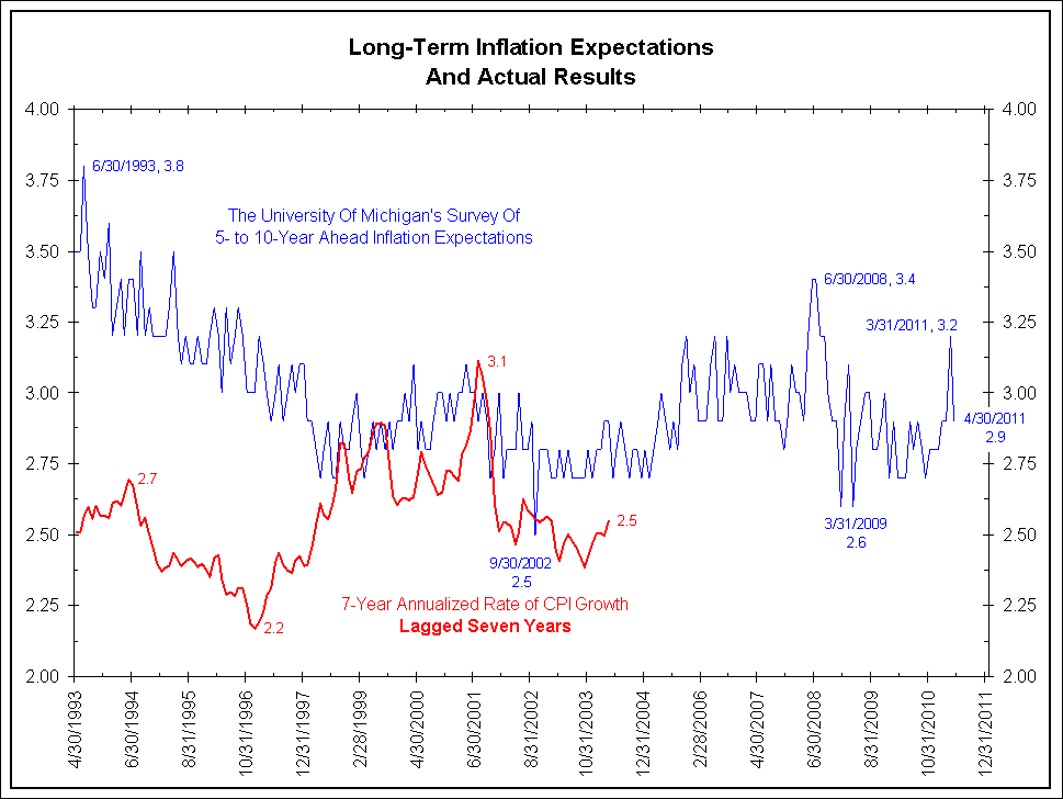 In the story above, the Federal Reserve is taking comfort that the results for the April survey for inflation expectations 5 to 10 years from now decreased. The last 15 years of results are shown below in blue. In red we show the 7-year annualized rate of CPI growth lagged seven years. We arbitrarily chose this measure since it is the mid-point between 5 and 10 years. In other words, the blue line shows inflation expectations from the Michigan survey 5 to 10 years in the future and the red line shows what actually happened over the next seven years.