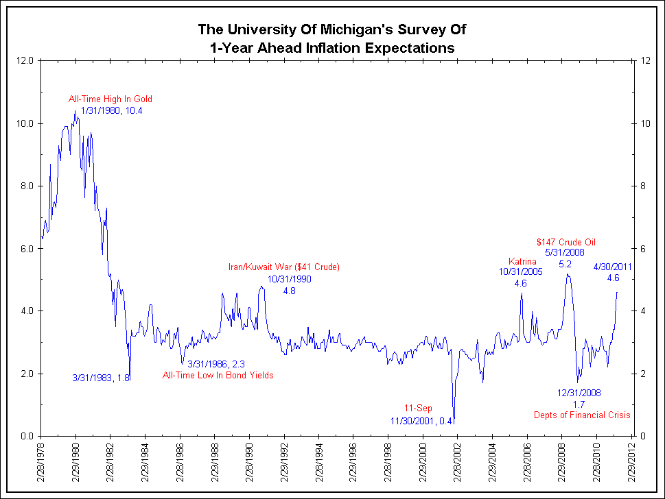 In the highlighted passage above, the Federal Reserve’s mouthpiece, Jon Hilsenrath, tells us that inflation expectations are moderating and actual inflation is under control. We have a different take.