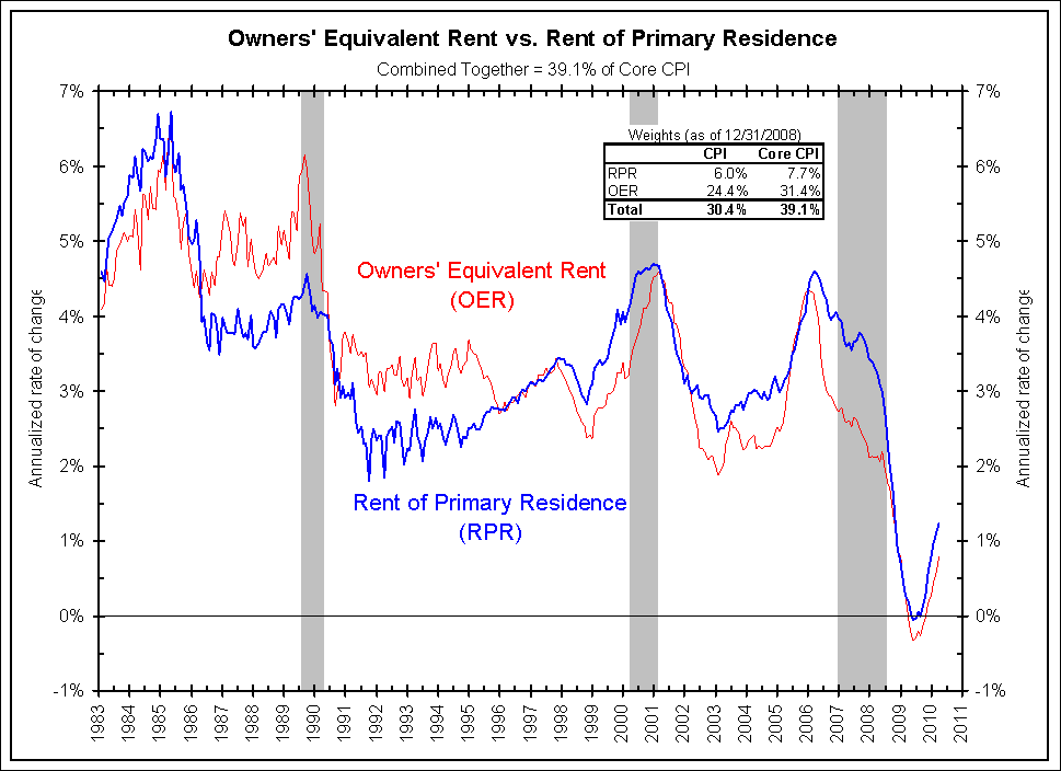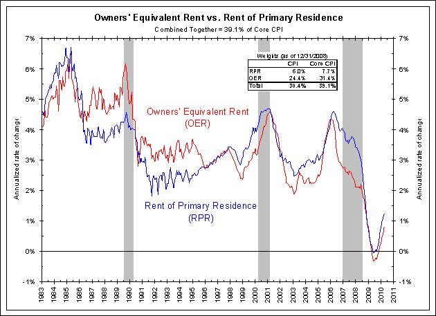 Although the first time homeowner’s tax credit may have artificially depressed housing inflation, it is now rebounding smartly. Over the last three months OER has risen by an annualized 1.25%, well above its 0.79% YoY rise. As predicted, renters’ inflation is also bouncing back strongly, up an annualized 1.86% over the last three months verses a rise of 1.23% YoY.