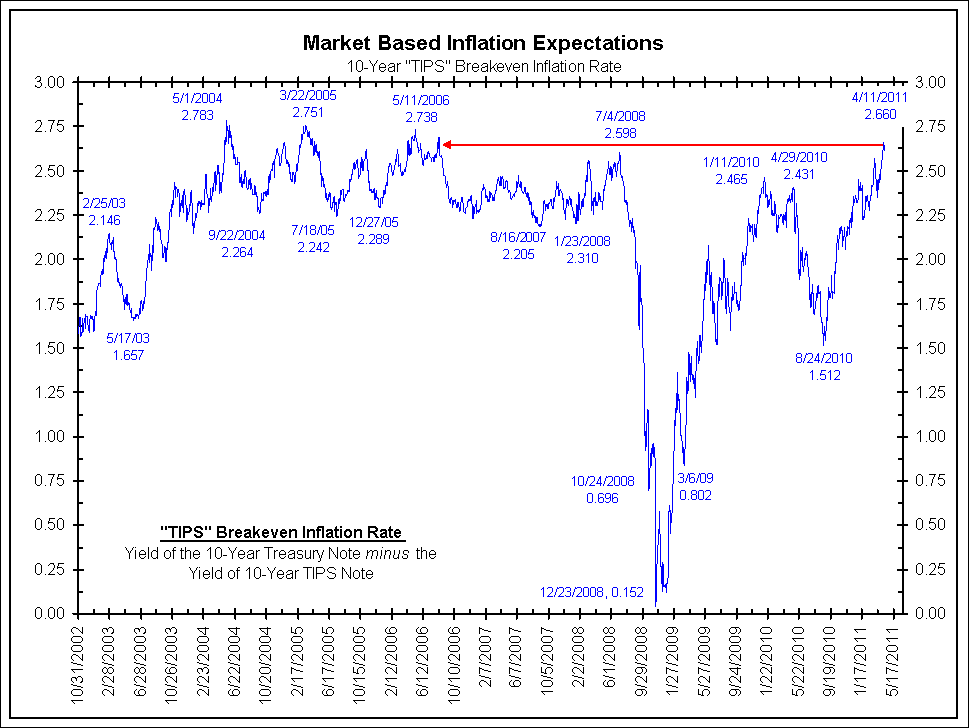 To put it bluntly, this survey is a poor predictor of future inflation. This was confirmed by a New York Federal Reserve study in 2008. This is why we prefer to use the Tips market as a forecast of expected inflation.
